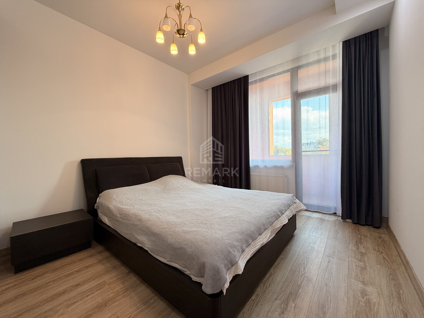 dormitor, living spațios, bucătărie complet utilată cu electrocasnice moderne, 2 blocuri sanitare, balcon.